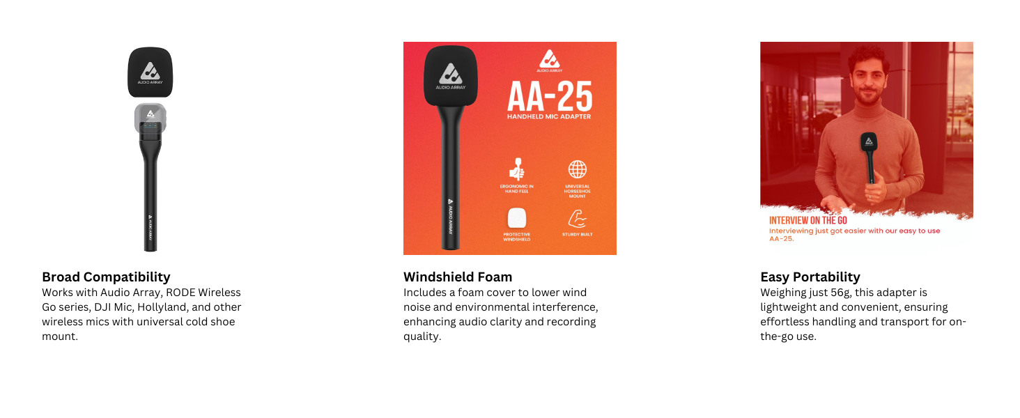 - COMPATIBILITY : The AA-25 Interview Handle Adapter by Audio Array is compatible with a wide range of wireless microphones, including Audio Array, RODE Wireless Go, Wireless Go II, Wireless ME, Wireless PRO, DJI Mic, Lark Max, Hollyland, and other brands that feature a universal cold shoe mount.
