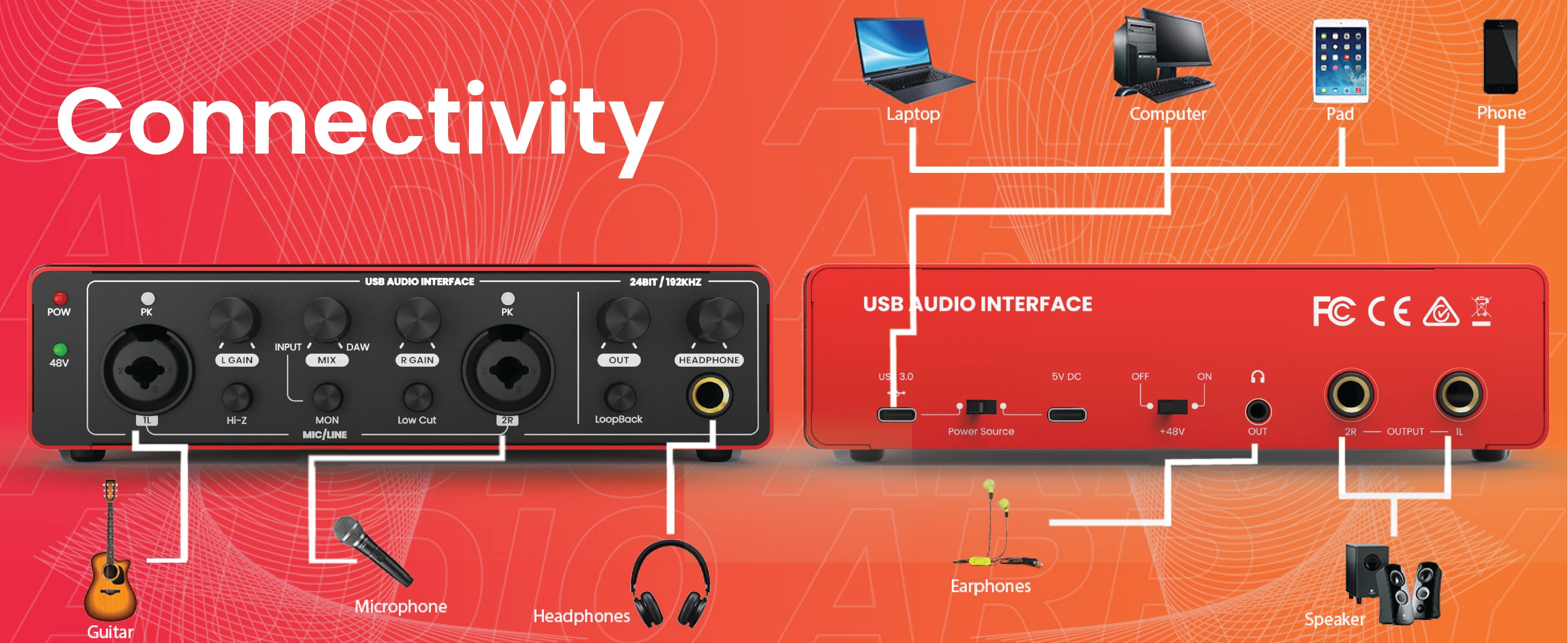 This compact 2x2 portable audio interface features dual combo XLR/MIC/LINE inputs with 48V phantom power and 2 independent TRS/TS stereo jacks for seamless connectivity with PA systems, monitors, amps, and recorders. Easily connect instruments using the 1/4" TRS/TS inputs.